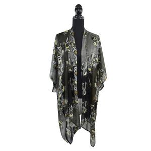 This kimono wrap offers a beautiful floral digital print on a mixed strip and solid background. This lightweight topper is ready to dress up or down and makes a great seasonal transition piece. 100% Viscose. Care: Dry Clean Only. One size. Measures: 55 W x 39.5 L.