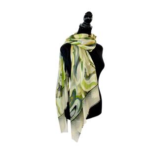 Take a trip back in time with this retro inspired wavy motif featuring an ombre geo print border and 4-sided eyelash fringe. Printed on a lightweight modal/silk blend, the stunning olive tones will make you stand out from the crowd. Materials: 90% Modal, 10% Silk. Measures: 27.5 in x 71 in.